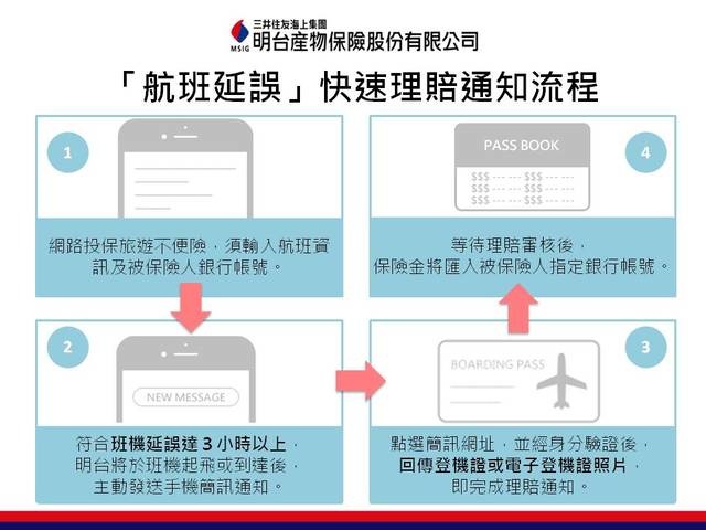 明台產險表示,網路投保該公司的旅平險和旅行不便險,不用申請班機延誤證明,延誤3小時賠3000元,延誤6小時則理賠6000元滿但網路投保旅遊不便險須輸入航班資訊及被保險人銀行帳號,符合班機延誤達3小時以上,明台將於班機起飛或到達後,主動發送手機簡訊通知,保戶點選簡訊網址,並經身分驗證後,回傳登機證或電子登機證的照片即完成理賠通知,等待理賠審核後,保險金將匯入被保險人指定銀行帳號。