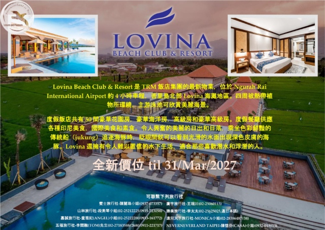 << TRM – Lovina Beach Club & Resort 全新價位 til 31/Mar/2027 >>