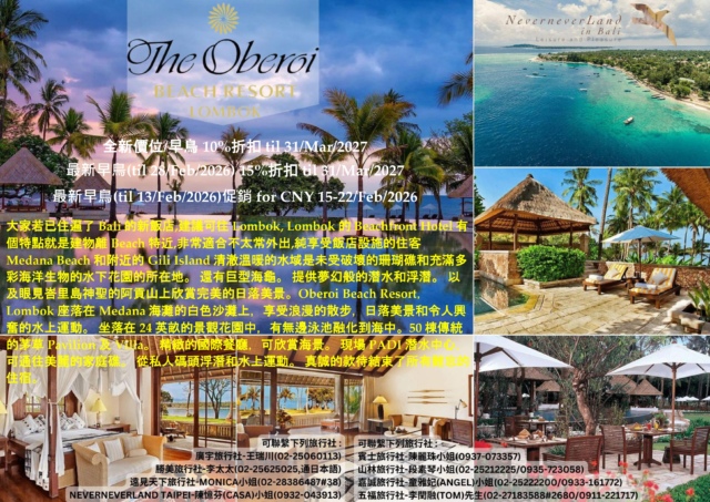 << Oberoi Lombok 全新價位/早鳥10%折扣 til 31/Mar/2027 & 最新早鳥(til 28/Feb/2026)15%折扣 til 31/Mar/2027 >>