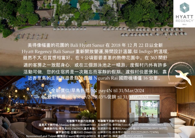 << Hyatt Regency Bali Sanur 全新價位/早鳥折扣/5 pay 4 til 31/Mar/2025 & 最新早鳥(til 31/Dec/2023)15%促銷 til 31/Mar/2024 & 最新早鳥(til 31/Mar/2024)20%促銷 til 21/Dec/2024 >>