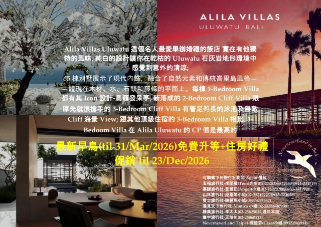 << Alila Villas Uluwatu 最新早鳥(til 31/Mar/2026)免費升等+住房好禮促銷 til 23/Dec/2026 >>