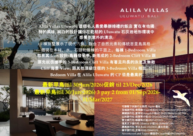 << Alila Villas Uluwatu 最新早鳥(til 30/Jun/2026)免費升等+住房好禮促銷 til 23/Dec/2026 & 3 Pay 2 from 01/Sep/2026-31/Mar/2027 >>