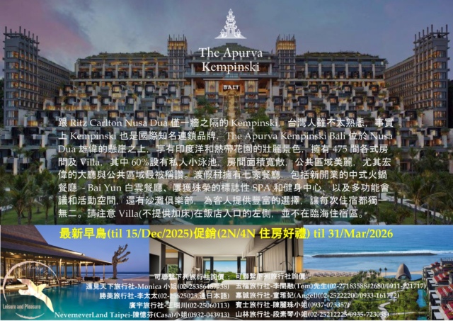 << Kempinski Nusa Dua 最新早鳥(til 15/Dec/2025)促銷 til 31/Mar/2026 >>