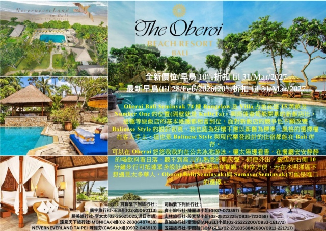 << Oberoi Bali Seminyak 全新價位 til 31/Mar/2027 & 最新早鳥(til 28/Feb/2026)20%折扣 til 31/Mar/2027 >>