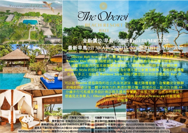 << Oberoi Bali Seminyak 全新價位 til 31/Mar/2027 & 最新早鳥(til 30/Apr/2026)15-20%折扣 til 31/Mar/2027 >>