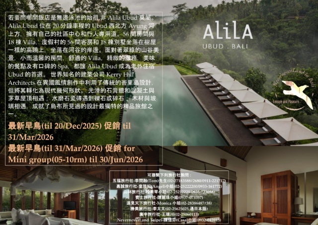 << Alila Ubud 最新早鳥(til 20/Dec/2025) 促銷 til 31/Mar/2026 & 最新早鳥(til 31/Mar/2026) for Mini group(05-10rm)促銷 til 30/Jun/2026 >>