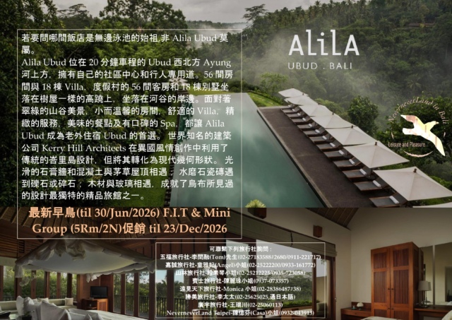 << Alila Ubud 最新早鳥(til 30/Jun/2026) F.I.T(min 2N) & Mini group(5rm/2N)促銷 til 23/Dec/2026 >>