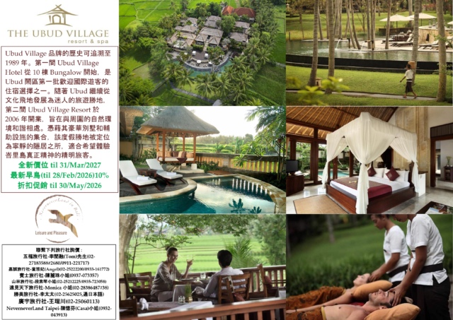 << Ubud Village Resort & Spa 全新價位 til 31/Mar/2027 & 最新早鳥(til 28/Feb/2026)10%折扣促銷 til 30/Jun/2026 >>