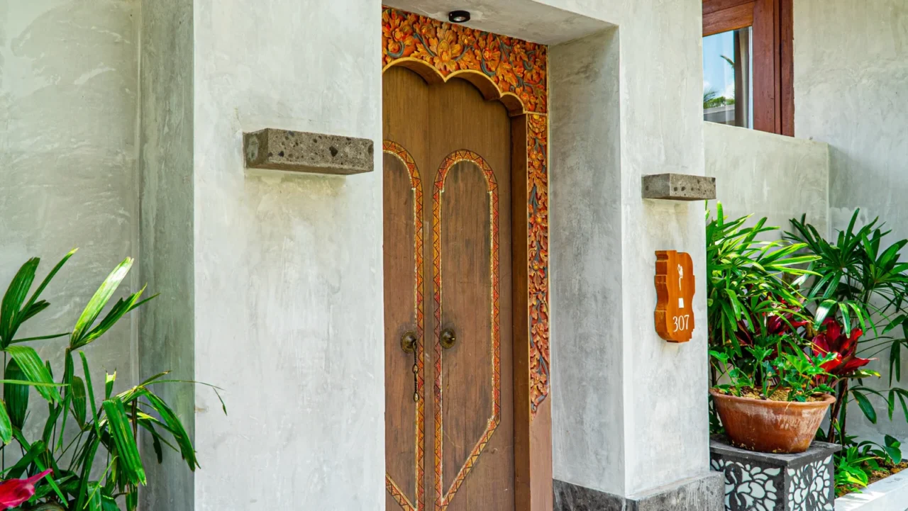 簡約的雕花大門,展現峇里島設計的純正韻味。這座精緻的別墅,令人嘆為觀止。