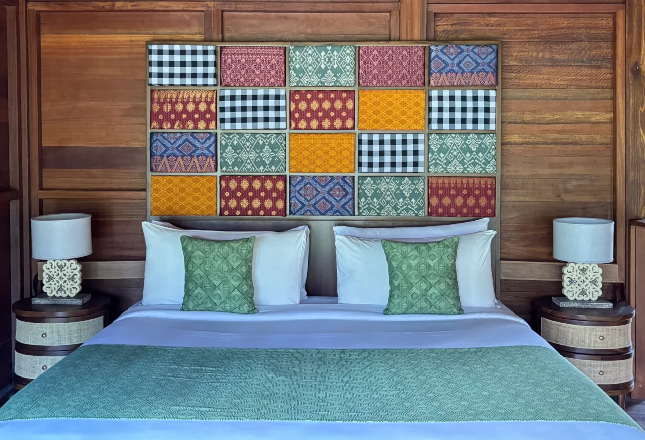 盡情享受我們為您精心打造的峇里島套房帶來的極致舒適體驗。套房設施齊全,從舒適的床鋪、溫馨的休息區、配備水療浴缸的精緻套間浴室到私人陽台,應有盡有,讓您徹底放鬆身心。床頭板上繪有佩圖魯村的迷人景色,包括著名的白鷺(kokokan),在迷人的背景燈光映襯下,更顯別緻。房間俯瞰叢林,與自然環境和諧相融。