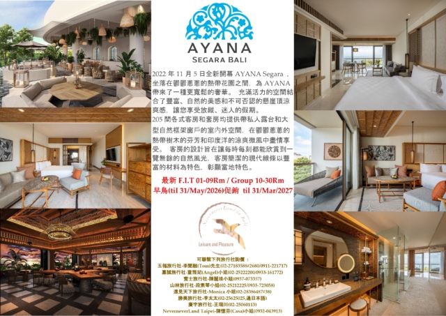<< AYANA ESTATE – AYANA Segara Bali – Jimbaran 最新F.I.T(01-09Rm) / Group(10-30Rm)早鳥(til 31/May/2026) 促銷 til 31/Mar/2027 >>