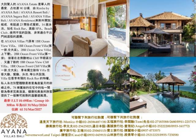 << AYANA ESTATE – AYANA Villas Bali – Jimbaran 最新F.I.T(01-09Rm) / Group(10-30Rm)早鳥(til 31/May/2026) 促銷 til 31/Mar/2027 >>