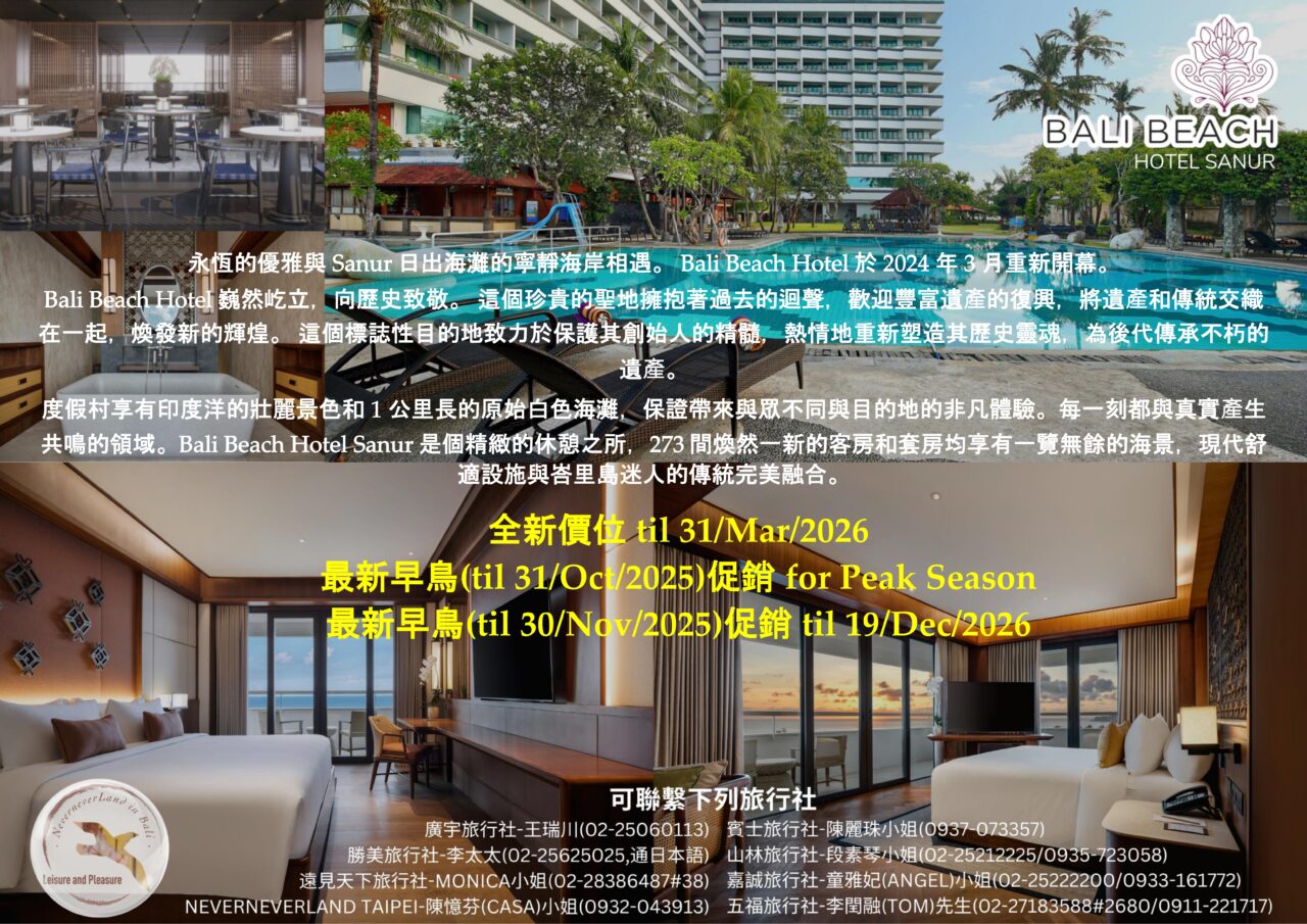 << Bali Beach Hotel – Sanur 全新價位 til 31/Mar/2026 & 最新早鳥(til 31/Oct/2025)促銷 for Peak Season & 最新早鳥(til 30/Nov/2025)促銷 til 19/Dec/2026 >>