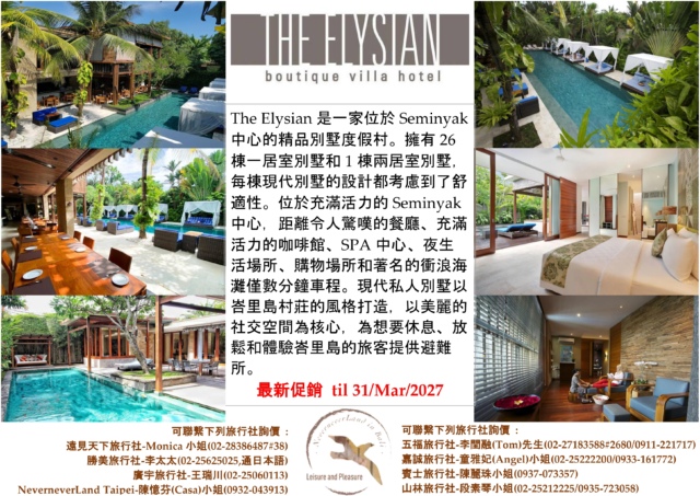 << The Elysian Boutique Villa – Seminyak 全新價位 til 31/Mar/2027 >>