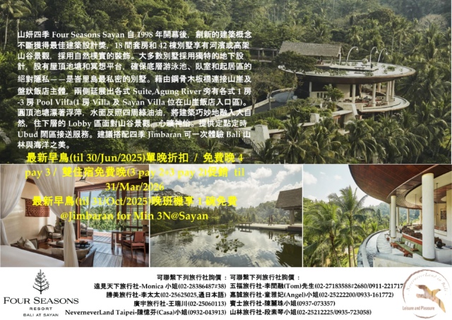 << Four Seasons Sayan Ubud 最新單晚20%促銷 / 雙住宿免費晚(3 pay 2@Jimbaran+3 pay 2@Sayan) / 免費晚4 pay 3促銷 til 31/Mar/2026 & 最新晚班機1N免費@Jimbaran+Min 3N@Sayan優惠 til 31/Mar/2026 >>