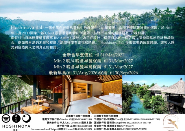 << HOSHINOYA Bali 全新(含早餐)價位 til 31/Mar/2027 & 最新(含早餐)早鳥促銷 til 31/Mar/2027 & 最新2N/4N(含早餐) til 31/Mar/2027 & 最新早鳥(til 31/Aug/2026)促銷 til 30/Sep/2026 >>