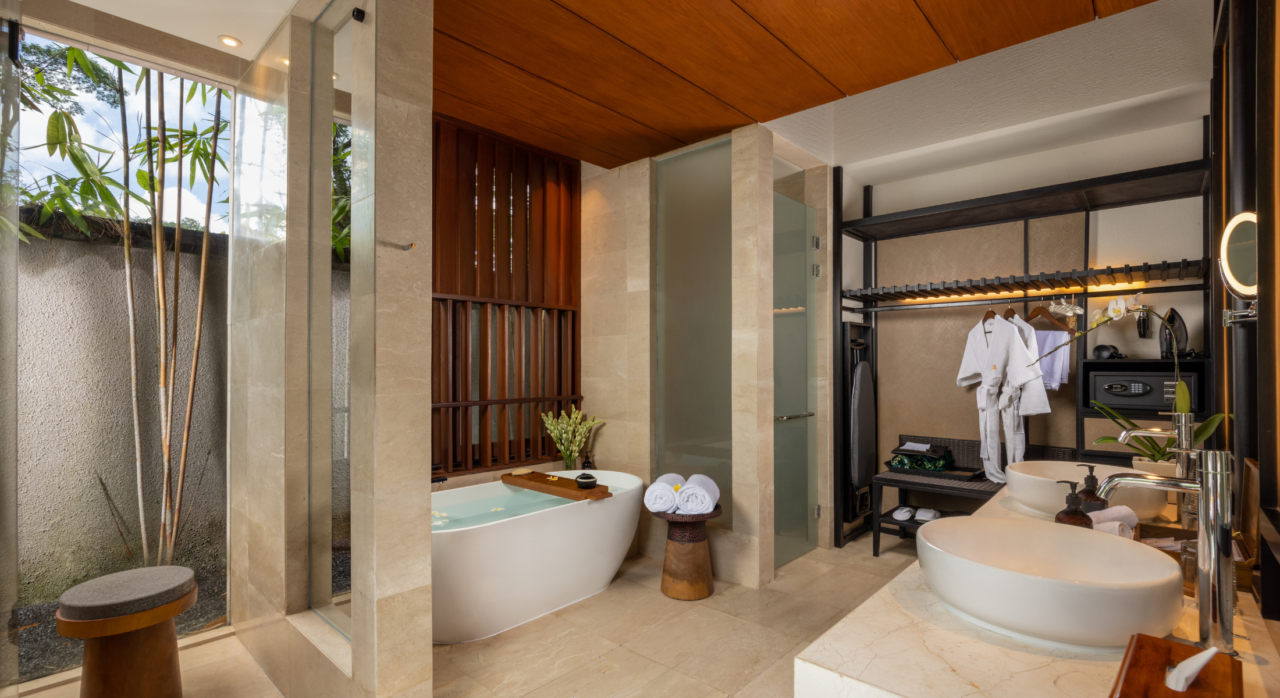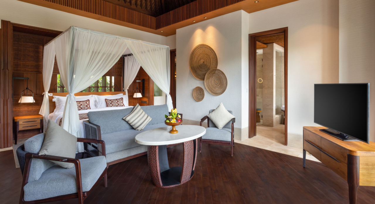 1BR Riverside Pool Villa (Anggrek/Teratai Riverside Pool Villa) – 16 units – (110–129 sqm) – king bed – bathtub – private pool
