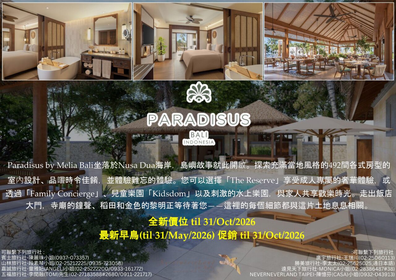 << Paradisus By Meliá Bali(原Meliá Bali) – Nusa Dua (2026/Feb/01重新開幕), 全新價位 til 31/Oct/2026 & 最新早鳥(til 31/May/2026)促銷 til 31/Oct/2026 >>