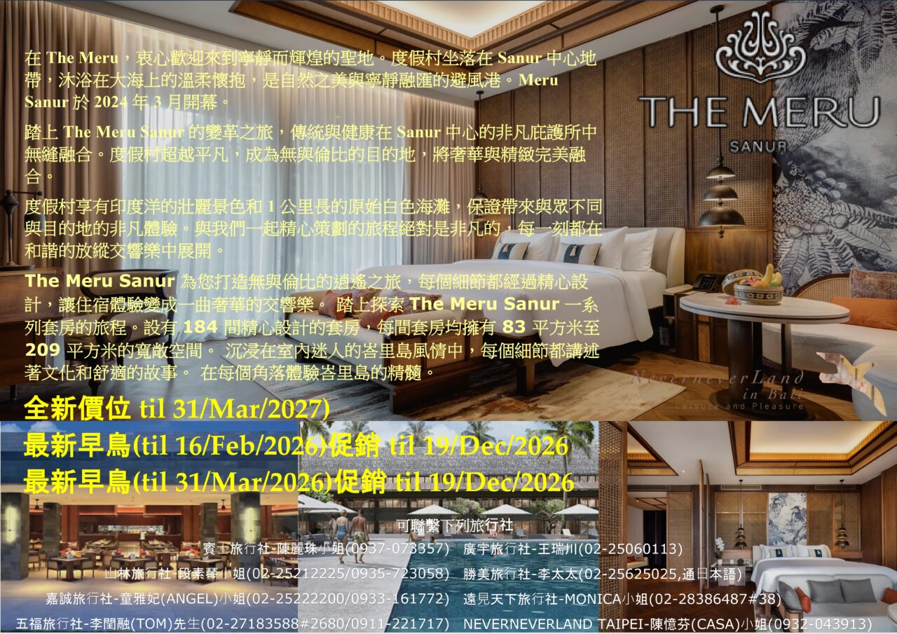 << HIG – The Meru Sanur 全新價位 til 31/Mar/2027 & 最新早鳥(til 16/Feb/2026 & 31/Mar/2026)促銷 til 19/Dec/2026 >>