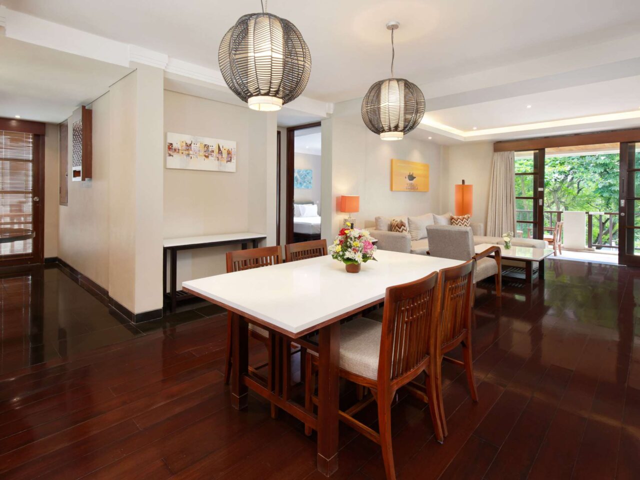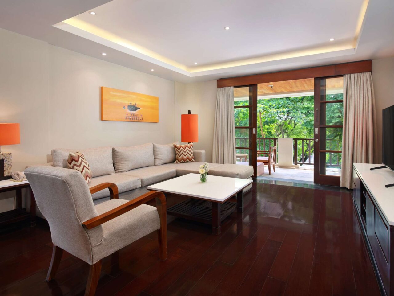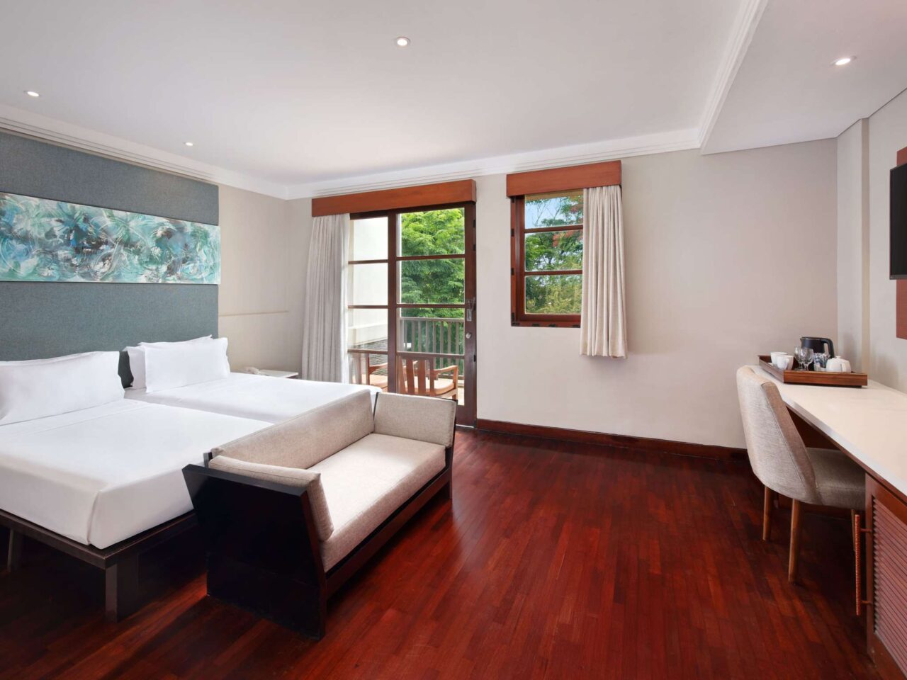 Modern and spacious room with king-size bed or twin-size bed, wooden flooring, private balcony overlooking lush garden, sofa, coffee/tea maker, free WiFi, and large bathroom with separate bathtub, shower and toilet. Up to 2 adults and 2 children sharing existing bed.