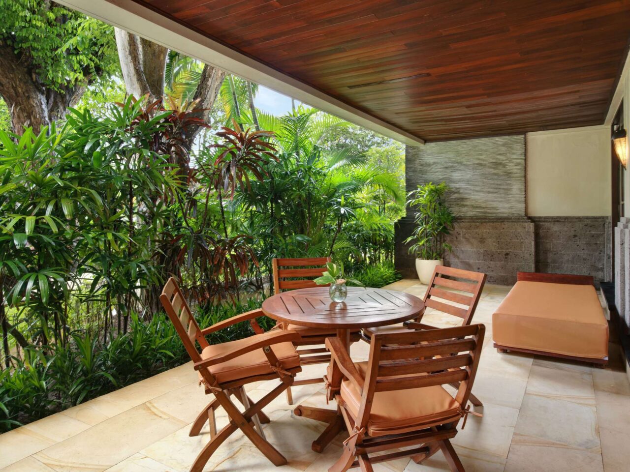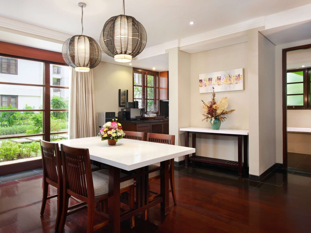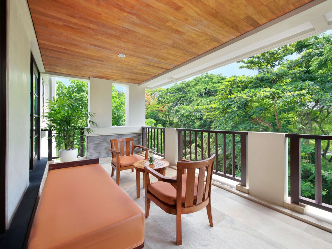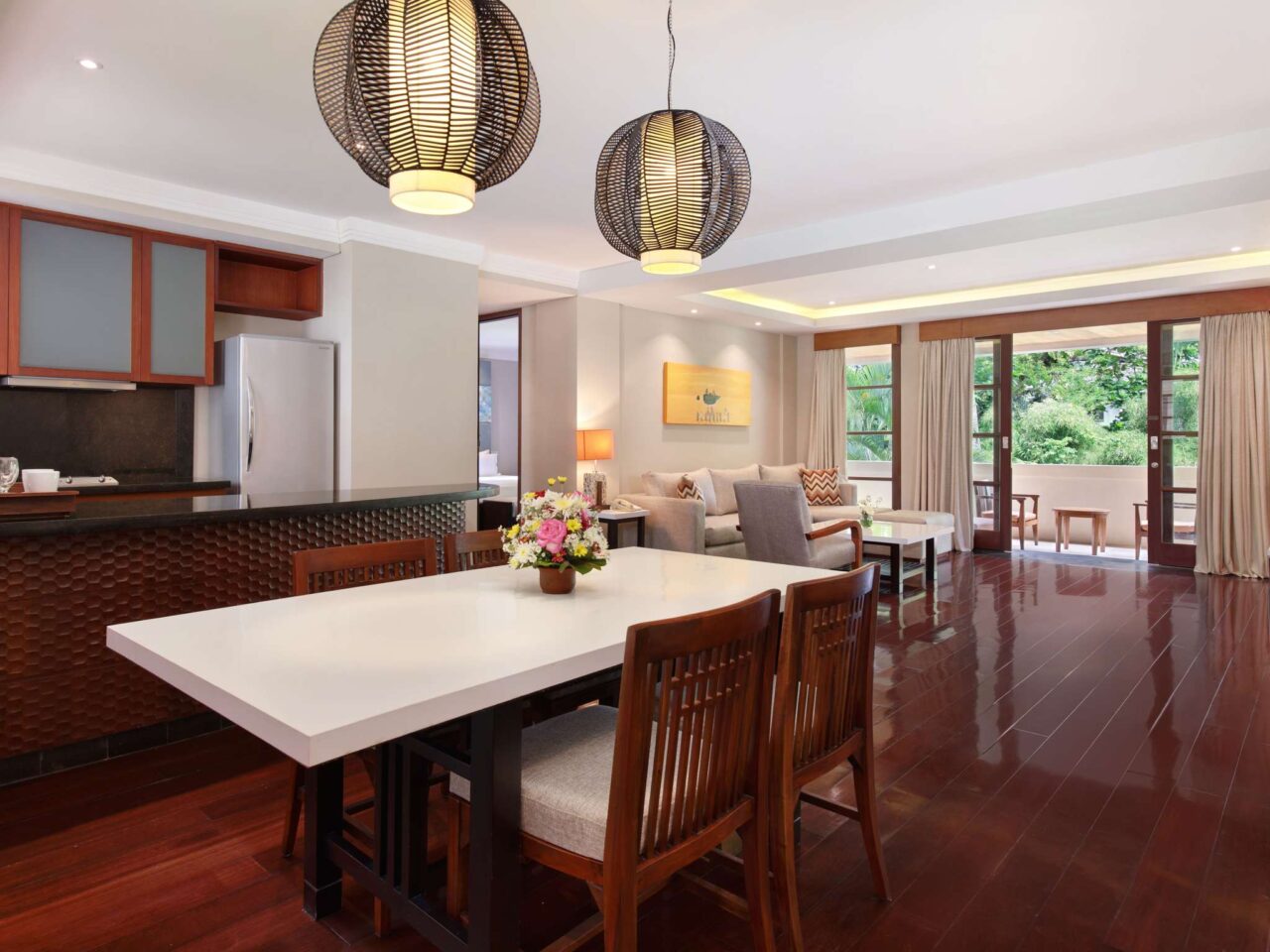 Modern and spacious room with king-size bed or twin-size bed, wooden flooring, private balcony overlooking lush garden, sofa, coffee/tea maker, free WiFi, and large bathroom with separate bathtub, shower and toilet. Up to 2 adults and 2 children sharing existing bed.