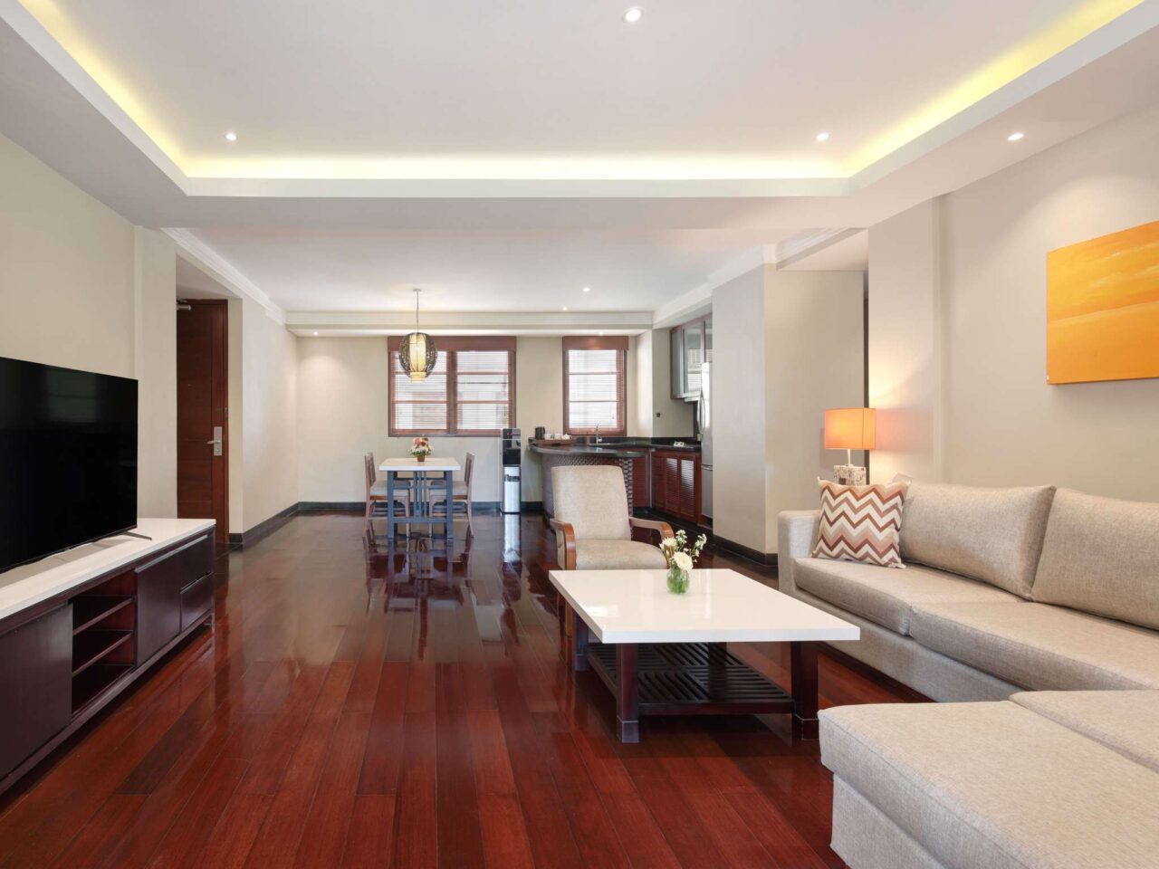 Spacious 2-bedrooms apartment suite with private balcony, living & dining areas, equipped kitchenette, 2 bathrooms, 32″ and 40″ TV, WiFi, safety box, coffee/tea maker. Up to 4 adults & 3 children sharing existing bed. Extra bed available. Fees applied.