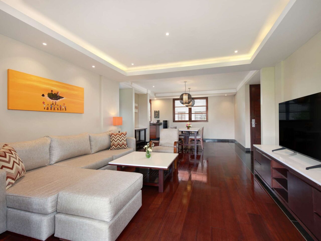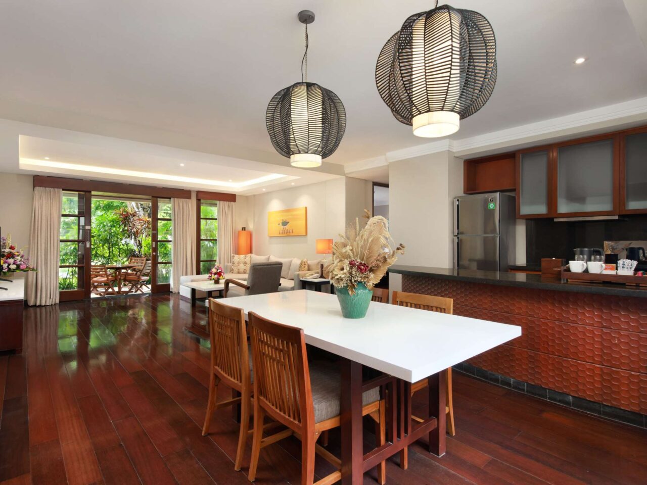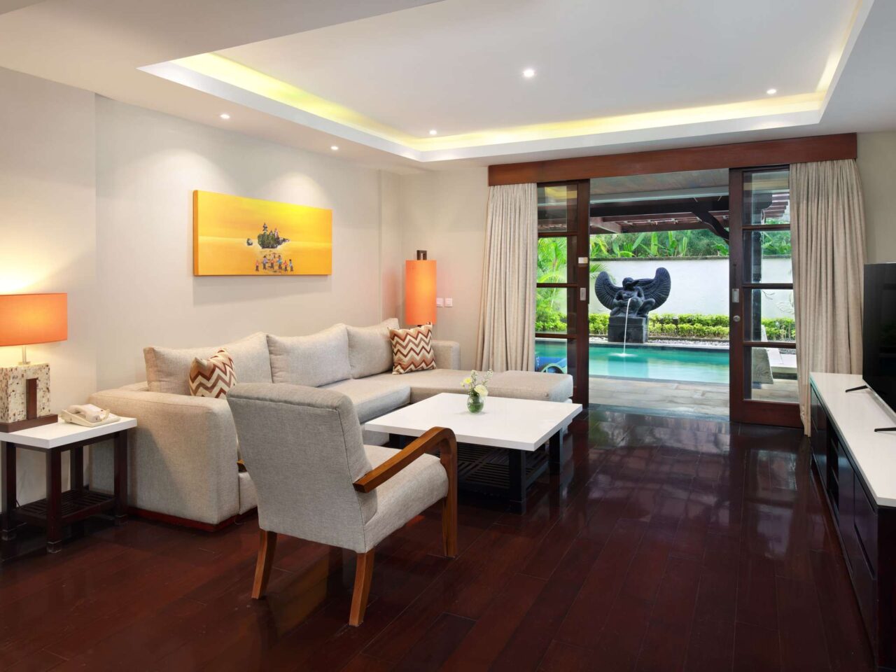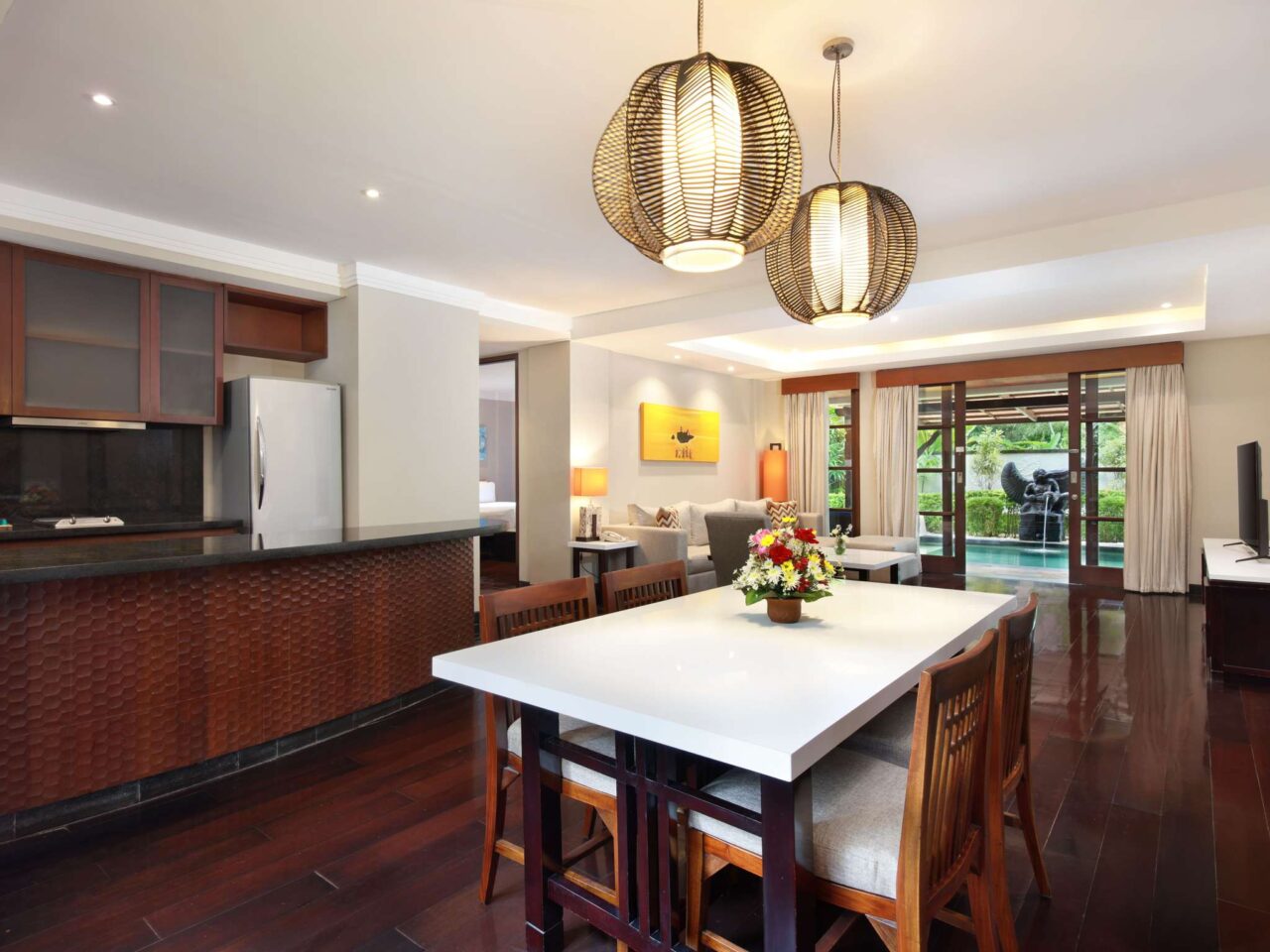 Spacious 2-bedrooms apartment suite with private pool, gazebo, living & dining areas, equipped kitchenette, 2 bathrooms, 32″ and 40″ TV, WiFi, safety box, coffee machine. Up to 4 adults & 3 children sharing existing bed. Extra bed available. Fees applied.