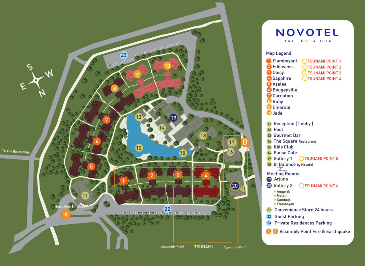 Novotel Bali Nusa Dua坐落在著名的安全門禁ITDC努沙杜瓦,擁有168間帶寬敞露台或陽台的客房以及配備小廚房、起居室和餐廳的綜合公寓套房。令人驚嘆的1,500平方米潟湖泳池位於熱帶花園、兒童泳池、遊樂場之間,距離私人海灘俱樂部2分鐘路程,可欣賞美麗的日出,帶來最佳的家庭度假體驗。Novotel Bali Nusa Dua為會員提供專屬體驗。