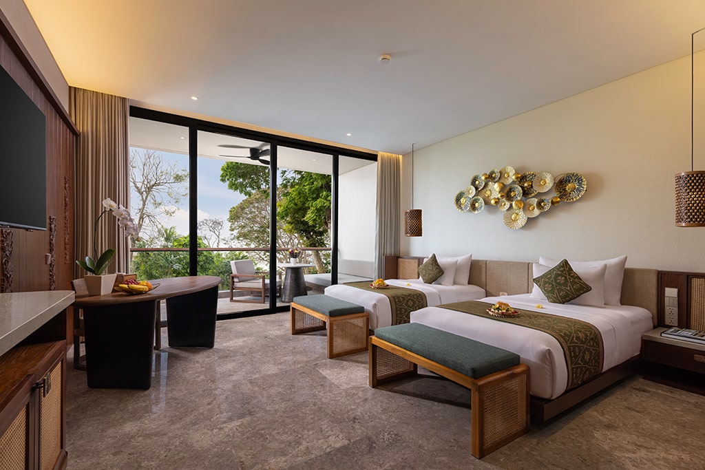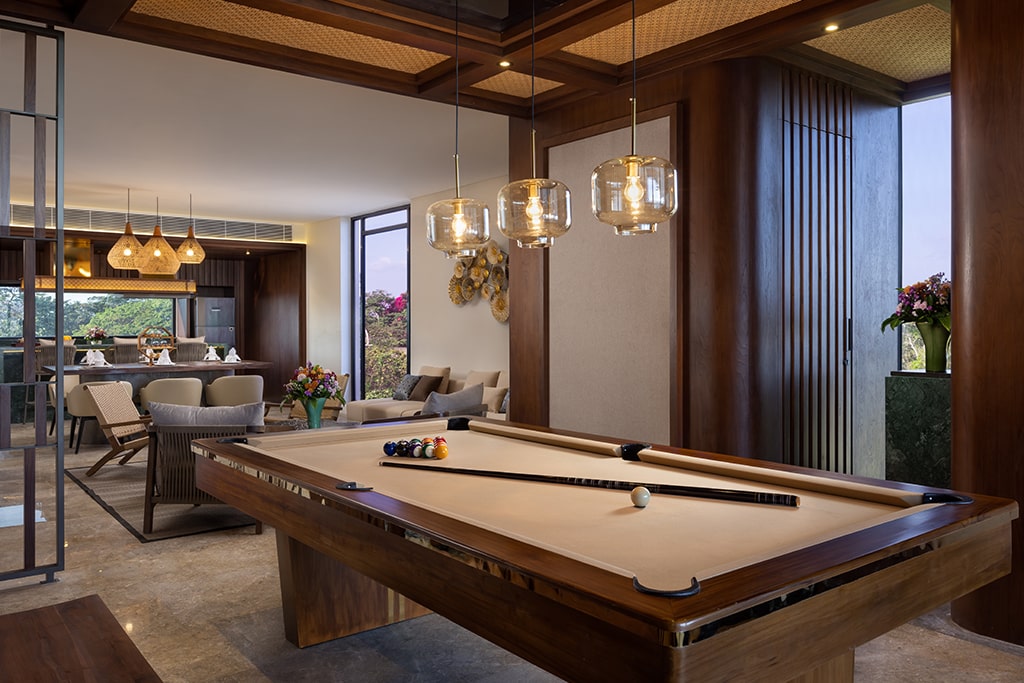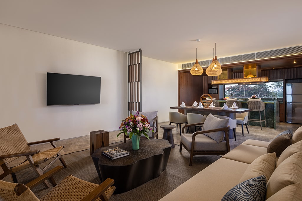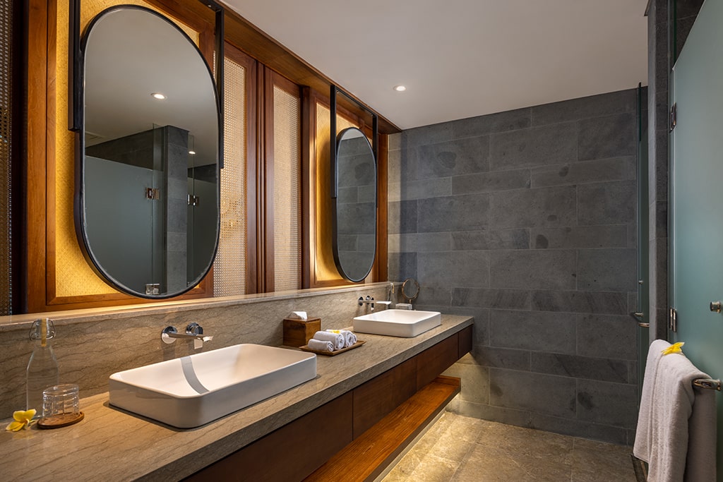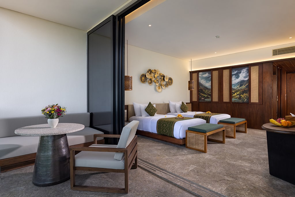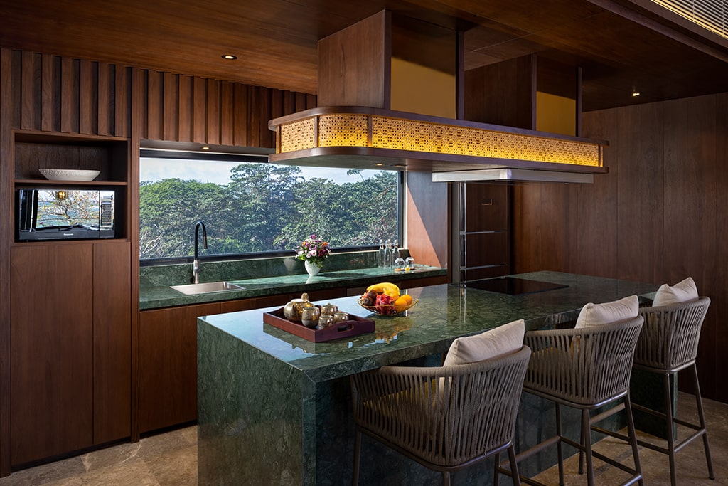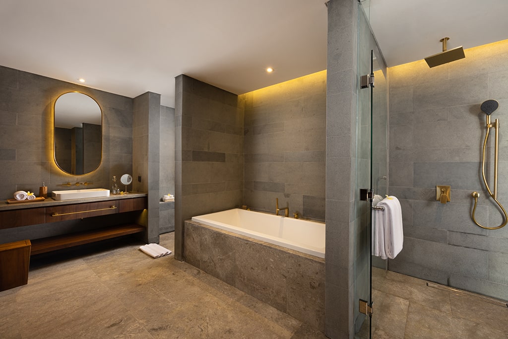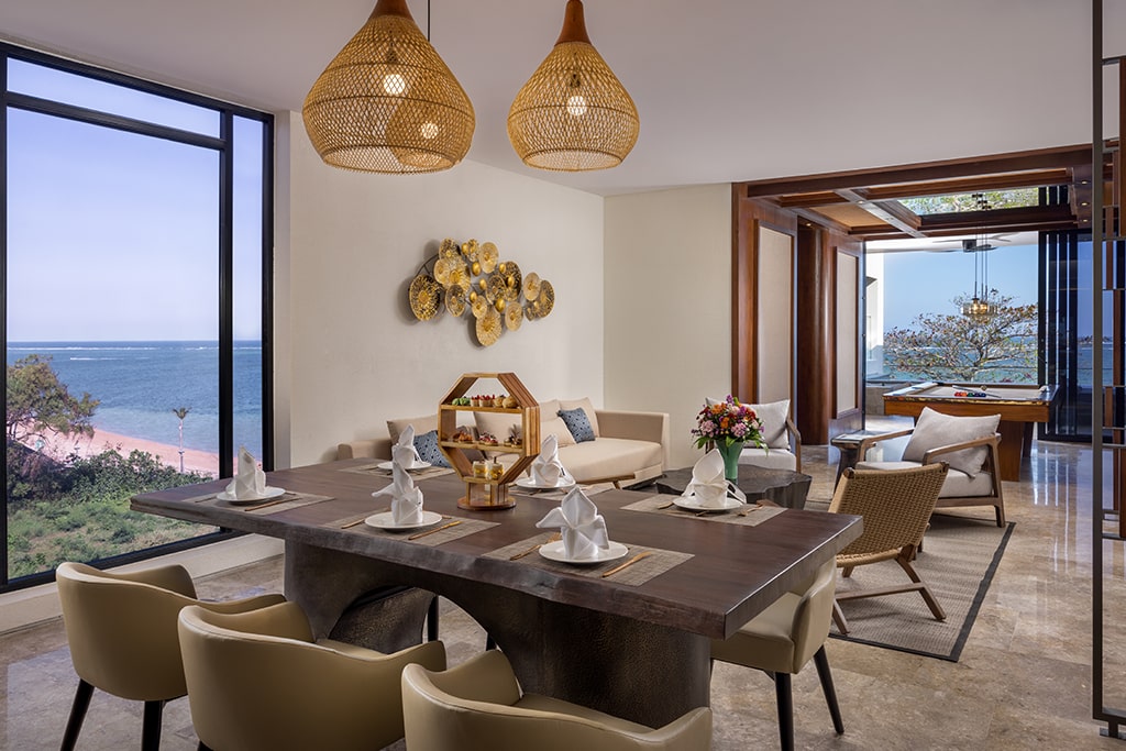 從將建築本身比作人體的「三界」(Tri Loka)概念中汲取靈感,並將這一理念融入住宿設計,旨在確保賓客在入住期間感受到和諧平衡。每棟別墅都經過精心選址,並沿中軸線巧妙佈局空間,賓客無論身處何處,都能欣賞到令人嘆為觀止的海岸線美景,例如在臥室、戶外泳池畔休憩,甚至在寬敞的浴缸中泡澡。