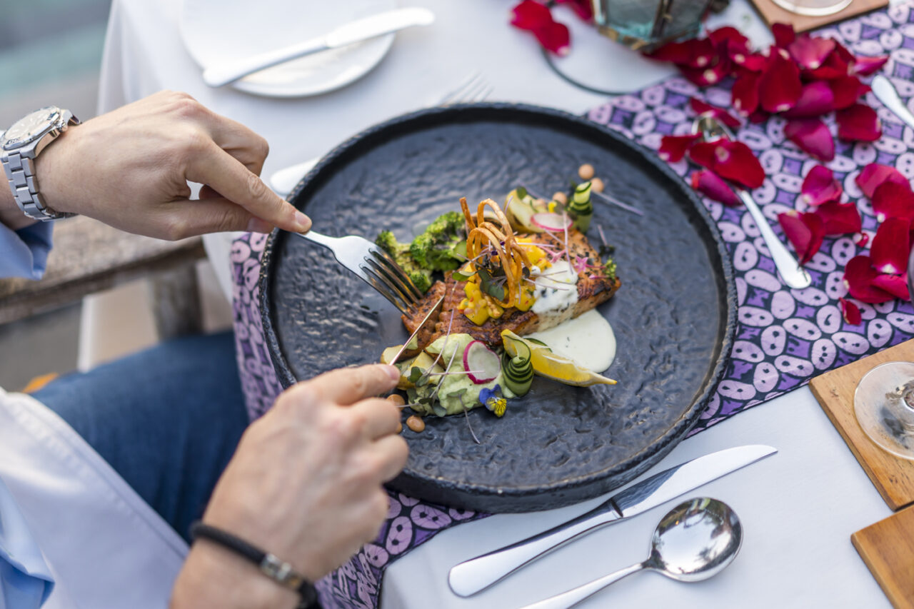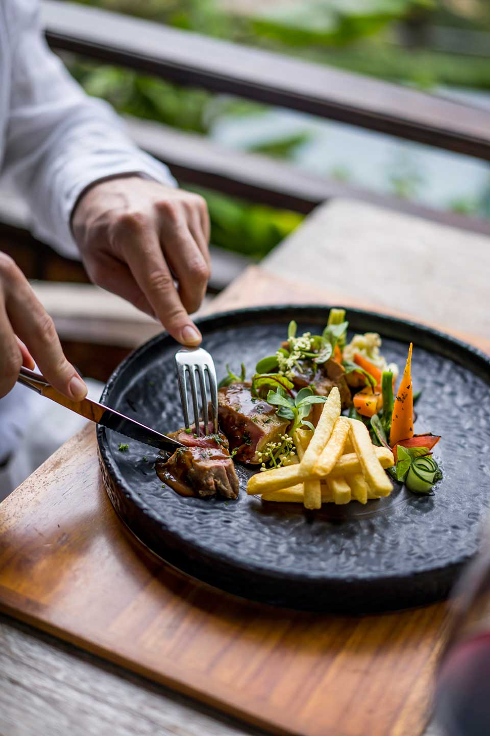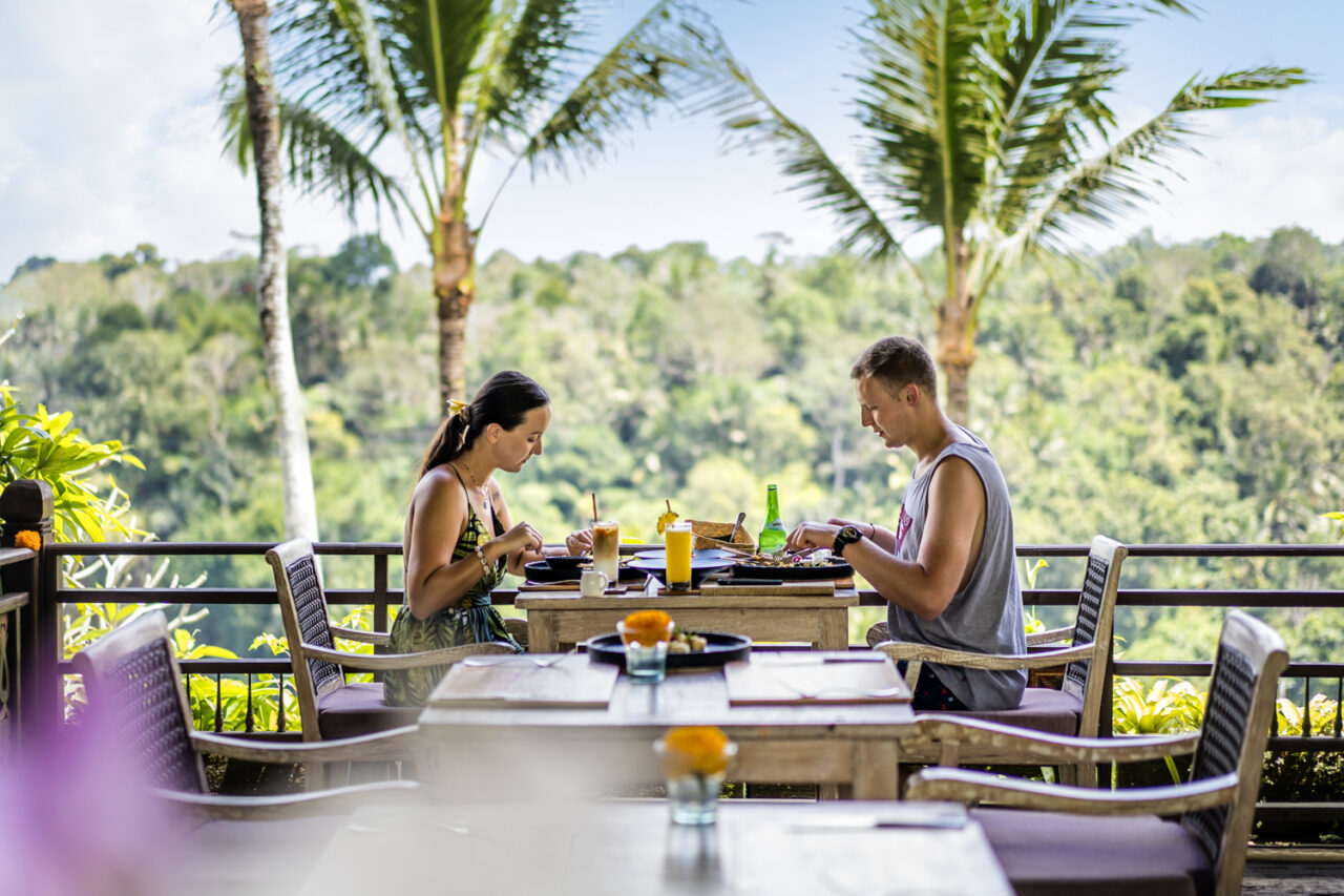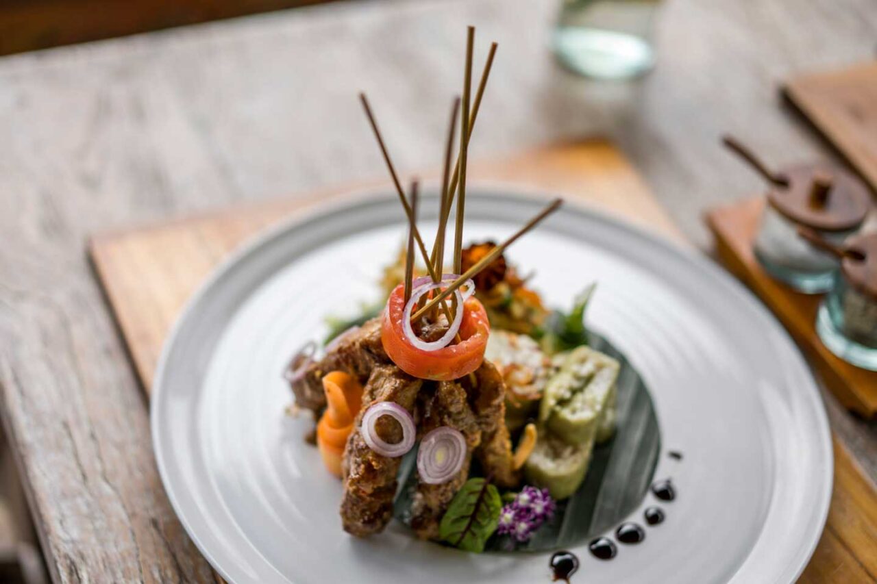 Pramana Watu Kurung的餐廳坐落於一座精美修復的古老爪哇傳統建築(Joglo)內,其精雕細琢的立柱展現了精湛的傳統工藝。這棟開放式建築可飽覽主泳池和周圍鬱鬱蔥蔥的叢林美景,營造出寧靜如畫的氛圍。餐廳永恆的風格提升了用餐體驗,讓賓客在品嚐美味佳餚的同時,也能充分調動感官享受。建築魅力與自然美景的完美融合,使這家餐廳成為令人難忘的用餐場所,每一餐都伴隨著非凡的視覺和感官體驗。