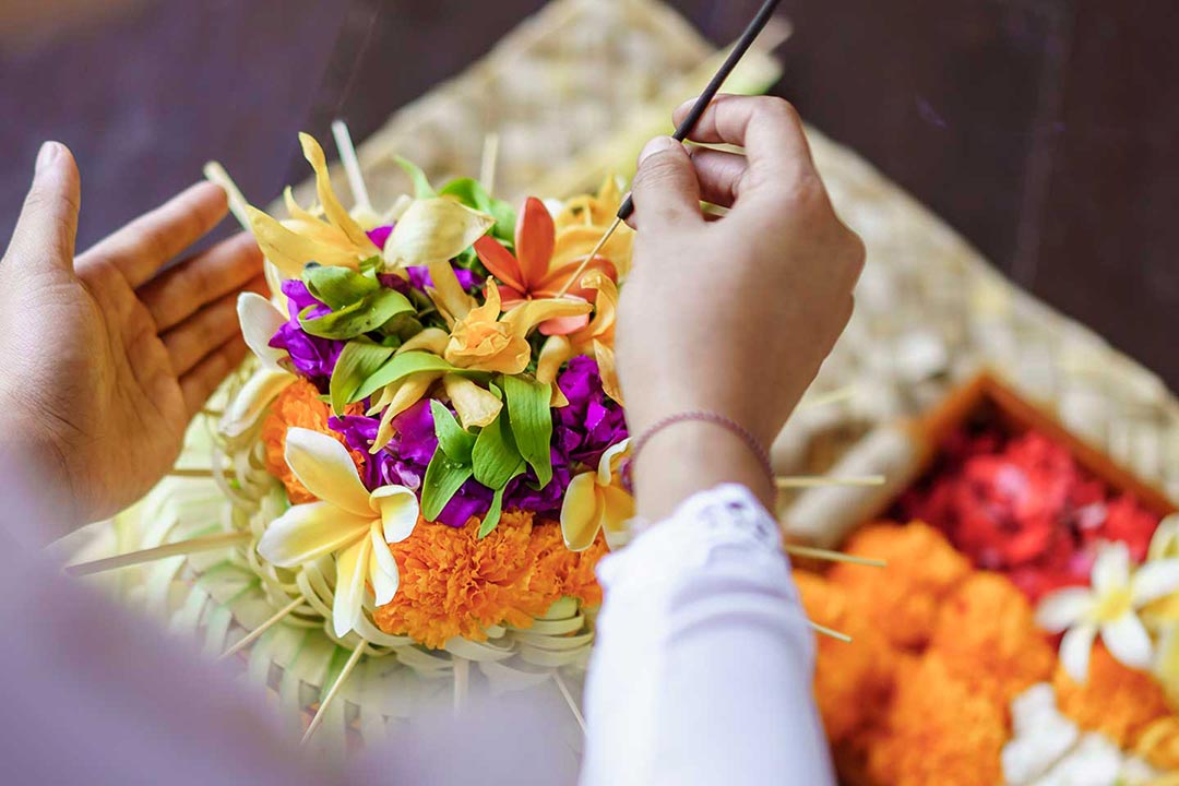 Metanding 是一種將各種供品組合成 Banten(Offering供品)的活動。 Mejejahitan 是 Metanding 的一部分,它將椰葉Coconut Leaf(Busung)與各種花葉縫製在一起。椰葉通常根據所需尺寸裁剪,然後用竹籤(semat,一種用竹子製成的小鉤子)縫合。我們誠摯邀請您參加 Surya Puja 瑜珈中心每日舉辦的 Metanding 和 Mejejahitan 製作活動。詳情請洽我們 24 小時前台。