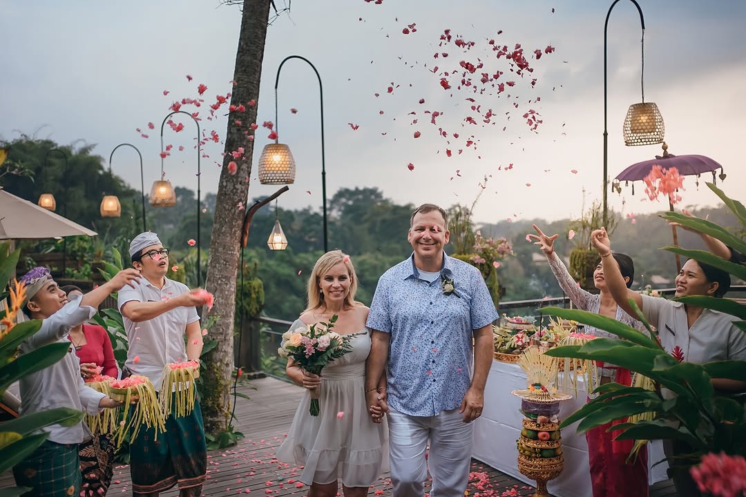 • Venue with full decoration in Balinese Style (signature wedding arch, flower petal for virgin aisle, flower petal for flower shower, flower on dinner table and lighting)
