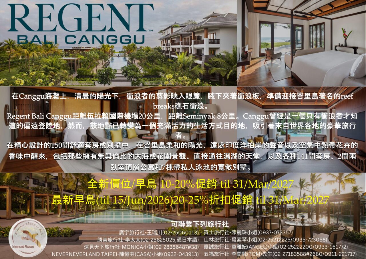 << IHG – Regent Bali Canggu 全新價位/早鳥10-20%折扣 til 31/Mar/2027 & 最新早鳥(til 15/Jun/2026)25%折扣促銷 til 31/Mar/2027 >>