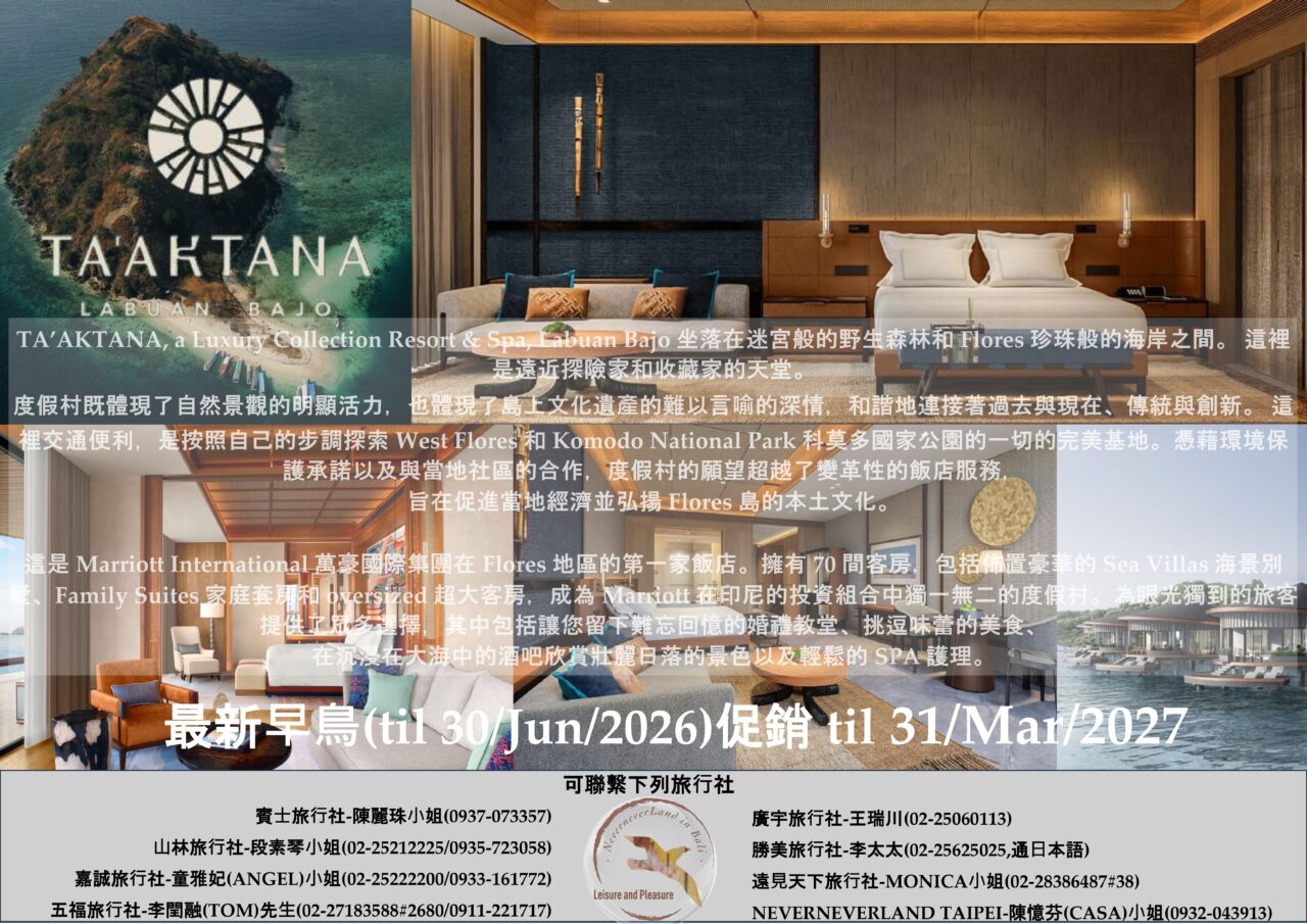<< Marriott – TA’AKTANA, a Luxury Collection Resort & Spa, Labuan Bajo 最新早鳥(til 30/Jun/2026)促銷til 31/Mar/2027 >>