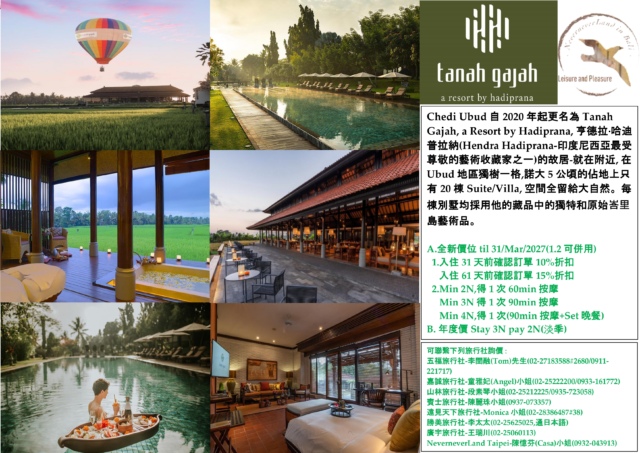 << Tanah Gajah, a Resort by Hadiprana(原Chedi Club Ubud) 全新價位/早鳥折扣/免費晚3N pay 2N til 31/Mar/2027 >>