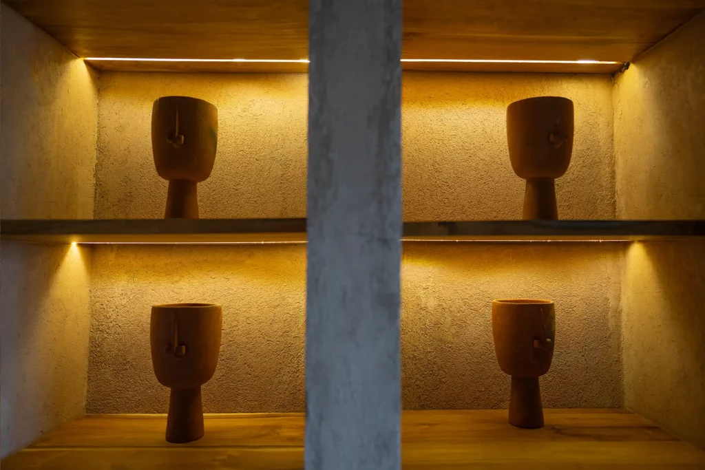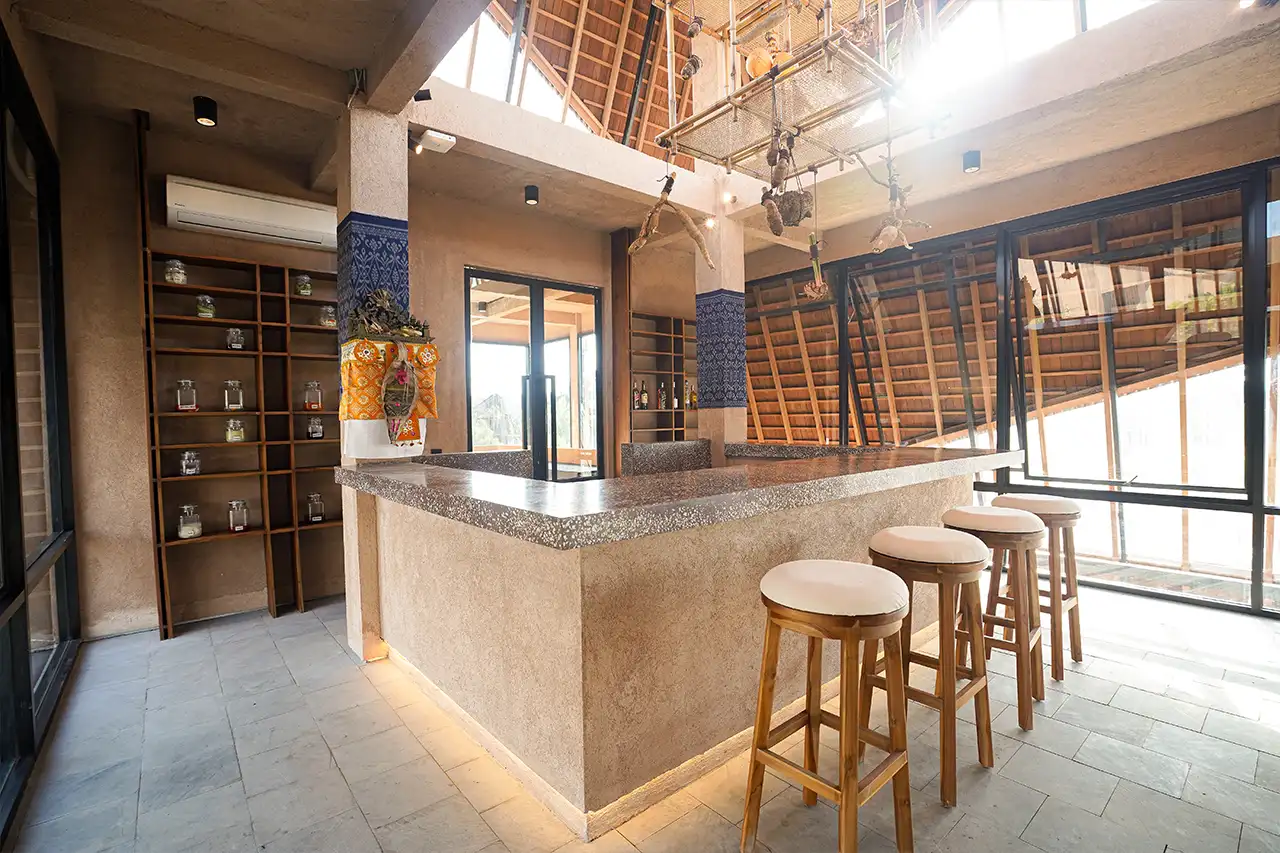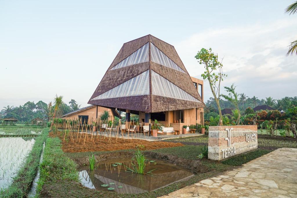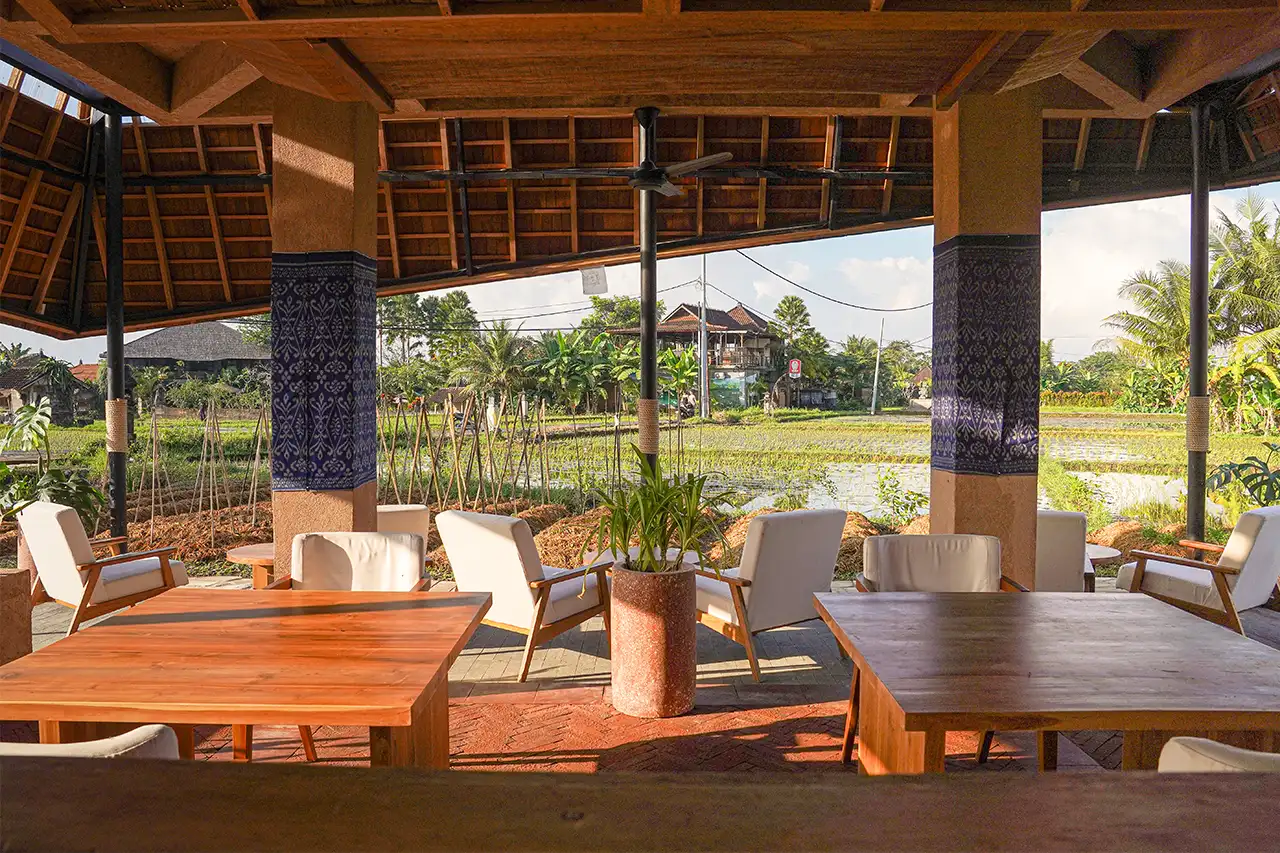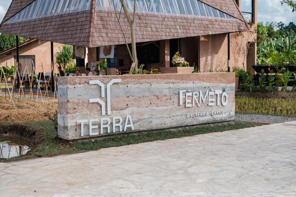 Ferméto餐廳位於 Terra Sayan飯店內,其建築設計靈感源自峇里島標誌性的傳統稻米倉庫(lumbung padi)。餐廳主體由現代粗獷的混凝土柱支撐,雙層結構以簡潔的線條和堅實的幾何造型重新詮釋了傳統建築風格。採用天然木材打造的屋頂裝飾(atap sirap kayu)則為建築增添了靜謐的優雅。
