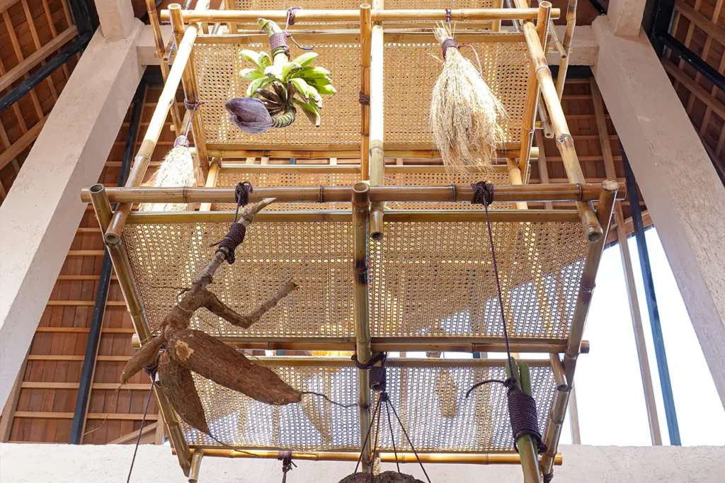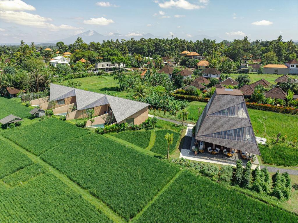 醒目的三角形造型點綴著建築,宛如天空中雕刻的輪廓。這設計如同燈塔,抽象的山巒,象徵穩固與提升,暗示峇里島農業宇宙觀的背景──土地、食物與精神在此交融。