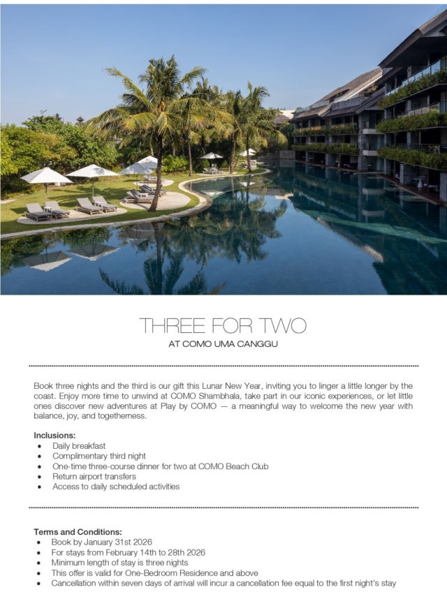<< COMO – Uma Canggu 全新價位 til 31/Mar/2026 & 最新早鳥(til 31/Jan/2026) 3 pay 2 during 14-28/Feb/2026 >>