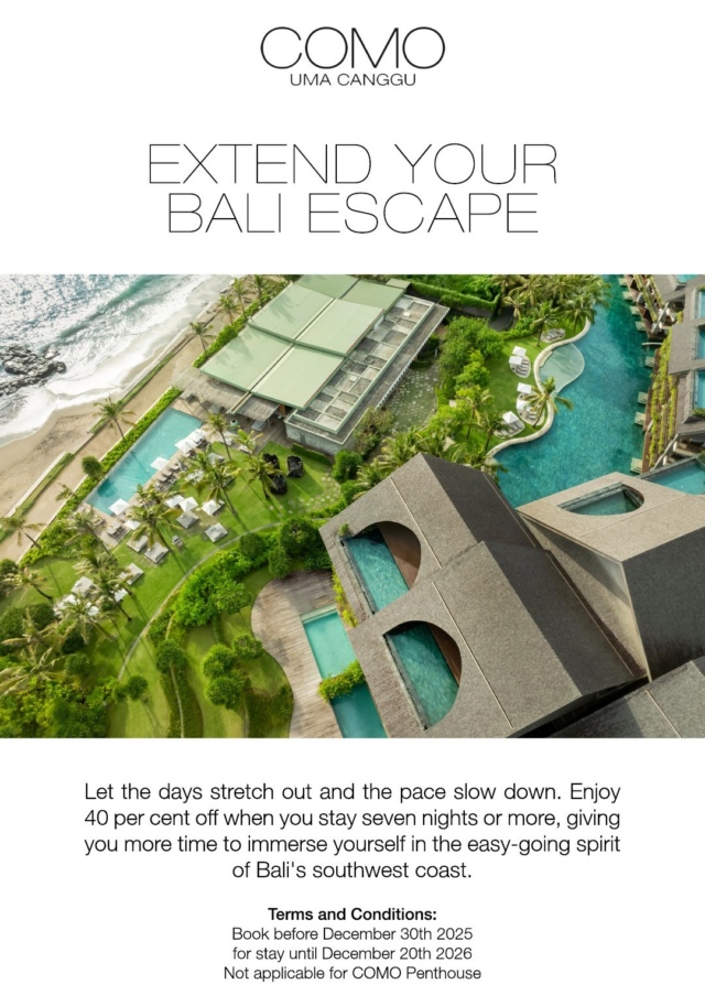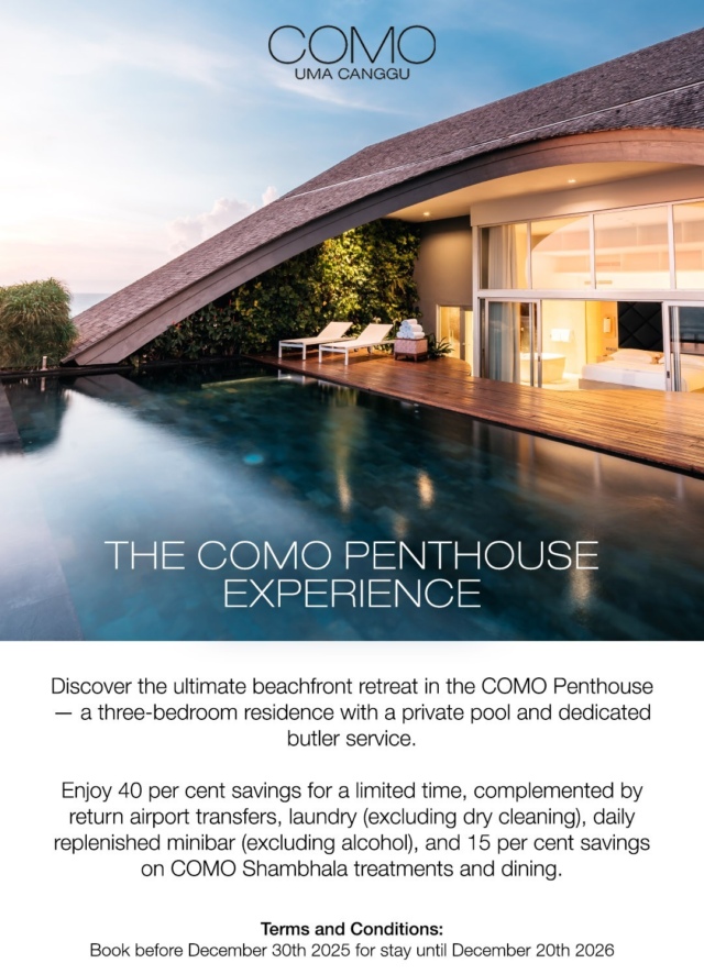 << COMO – Uma Canggu 全新價位 til 31/Mar/2026 & 最新早鳥(til 30/Dec/2025)Stay 3N pay 2N /Min 7N 40%折扣/30%折扣/40%折扣for 3-br Penthouse til 20/Dec/2026 >>