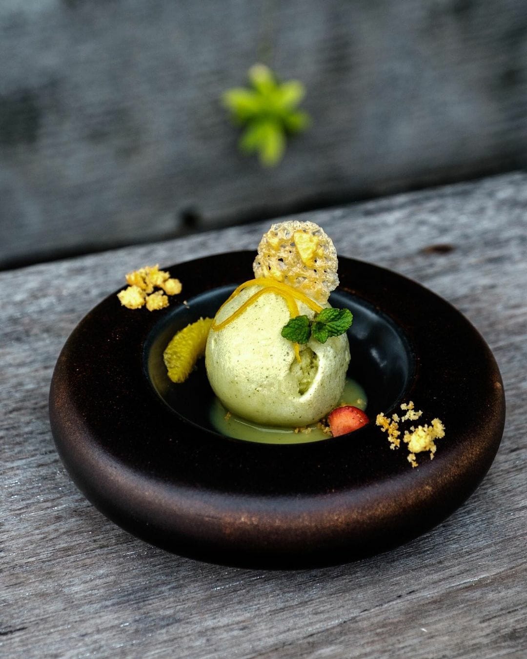 菜餚現代而有趣,同時又溫馨又舒適,基於日本經典的烹飪方法,簡單、極其新鮮、精確和細緻,但帶有一絲令人興奮的風味扭曲以及輕微受到其他亞洲國家成分的影響。例如扇貝壽司配Wakame salad和峇里島sambal matah, Kyushu Nigiri九州握壽司配印度尼西亞basil leaf羅勒葉, Tai Nigiri大握壽司配 breadcrumbs 麵包屑和lightly poached quail egg輕煮鵪鶉蛋,Mekatoro Nigiri配酪梨和ceviche酸橘汁醃魚醬。Grilled Salmon烤三文魚配Eggplant茄子,用burnt stalk of Balinese heirloom rice燒焦的峇里島傳家大米熏制的三文魚。讓我們品嚐罪惡的甜點,Chocolate Cigar-Smokey dark Javanese organic cocoa mousse巧克力雪茄煙熏黑爪哇有機可可慕斯搭配torch ginger flower sorbet火炬薑花冰沙搭配碎巧克力 和candied orange蜜餞橙子, Banana Crémeux香蕉奶油搭配Caramelized Miso Cream焦糖味噌奶油,Lemon Pannacotta檸檬帕納科塔搭配Oba Leaf Granita歐巴葉格蘭尼塔。