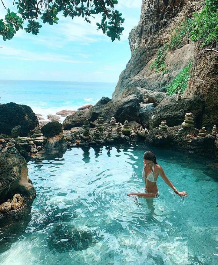 這個泉水的存在對於Nusa Penida的居民來說似乎是個謎。泉水清澈見底,呈綠色。這個泉水形成了一個大小約10×8平方米的湖泊,深度也達10米。因此,如果沒有游泳的能力,就需要小心和警惕。在這裡泡澡就像置身於私人按摩浴缸中。第一個泉水池的顏色是深藍色。其上有高達3米、5米的懸崖峭壁,常用於跳躍。獨特的是,這個湖中游泳池的位置只允許想要泡澡的男性遊客。
